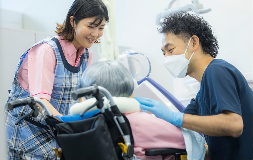 当院では、病院・施設で療養中の患者さんに対し、訪問歯科診療を行っています。口腔ケアや摂食嚥下リハビリテーション、口腔機能・嚥下機能評価などを通して、一人ひとりに適した治療や支援をご提案いたします。現場には歯科医師・歯科衛生士が伺い、口腔管理の視点からチーム医療の一員として貢献いたします。歯やお口の症状や困りごと、摂食・嚥下に関するご相談はお気軽に当院までお問い合わせください。